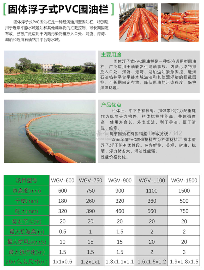 固体浮子式PVC围油栏中WGV600.450型适用在水池、池塘以及其它较平稳的水域,WGV750适用在河流,WGV800、WGV900适用江河和海港,WGV1100、WGV1500适用在港湾和近海石油平台等风浪大,水流急的水域。